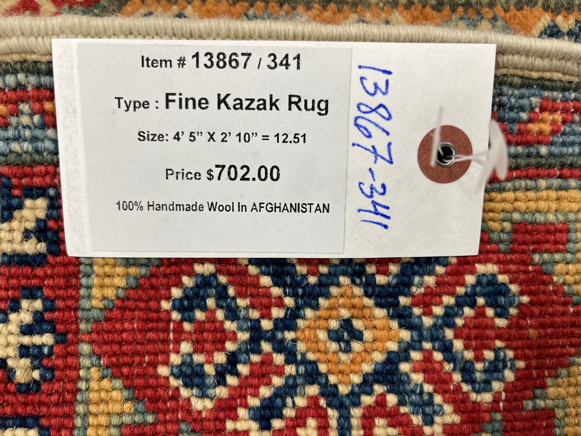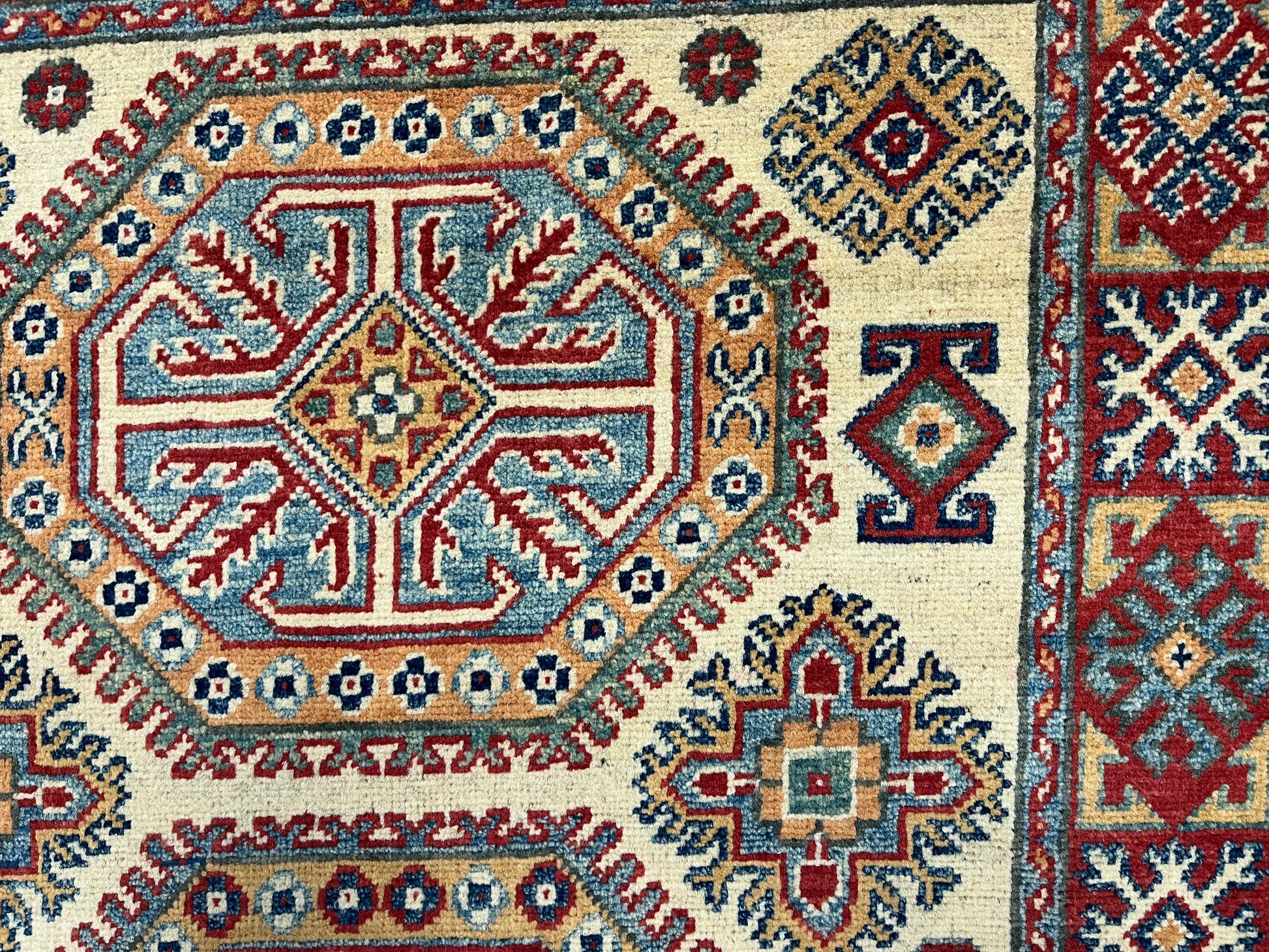 This authentic and genuine Hand Knotted rug displays Kazak design, features 100% Wool pile construction on a durable Cotton, please see the pictures above for more details.