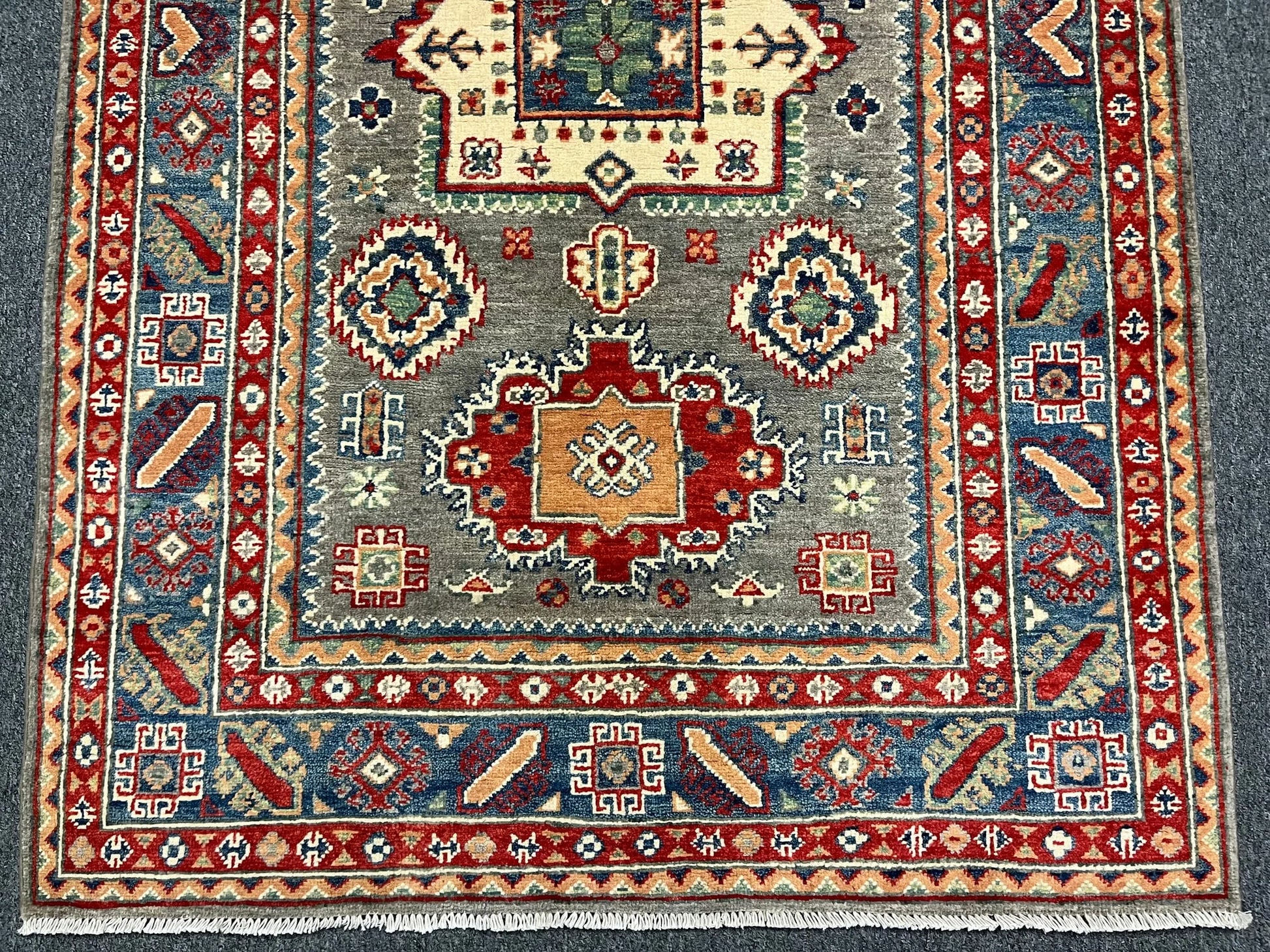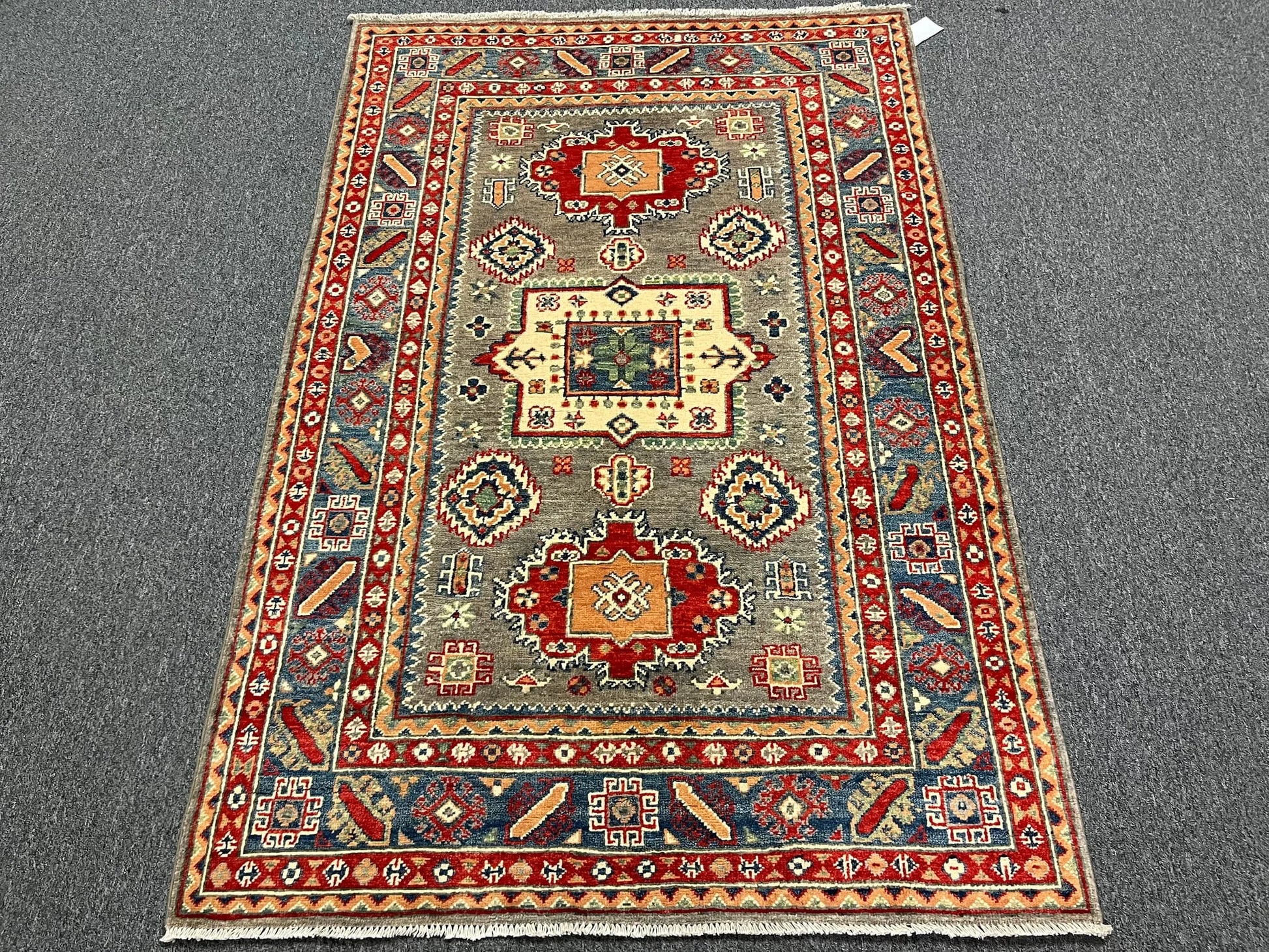 4X6 Kazak Brown/Blue Geometric Handmade Wool Rug # 12990